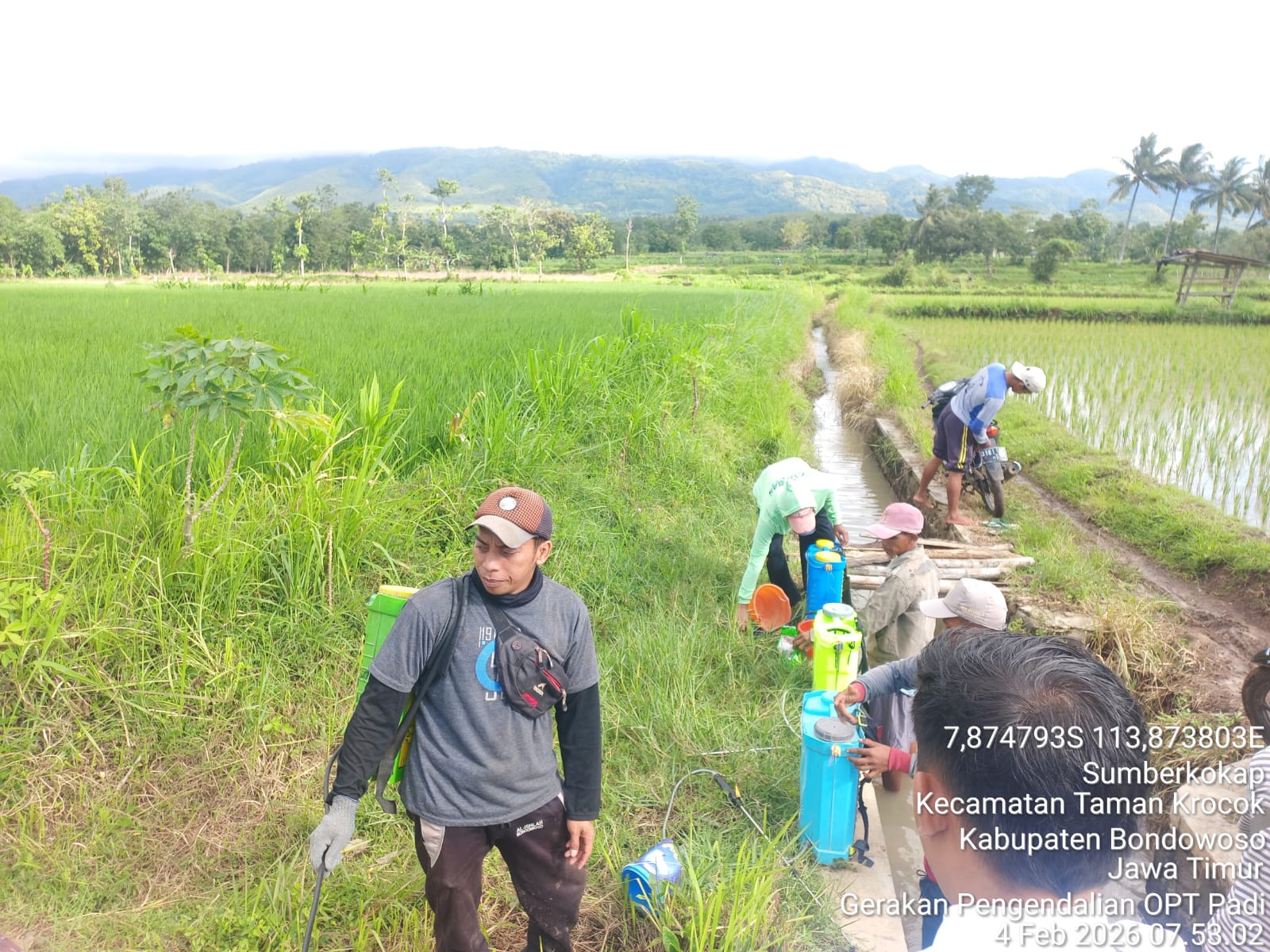 Dalam upaya menjaga produktivitas tanaman padi serta menekan kehilangan hasil akibat serangan organisme pengganggu tanaman (OPT), telah dilaksanakan Gerakan Pengendalian OPT Padi pada Rabu, 4 Februari 2026, bertempat di Kelompok Tani Talang Rejo I, Desa Sumber Kokap, Kecamatan Taman Krocok, Kabupaten Bondowoso, Provinsi Jawa Timur.